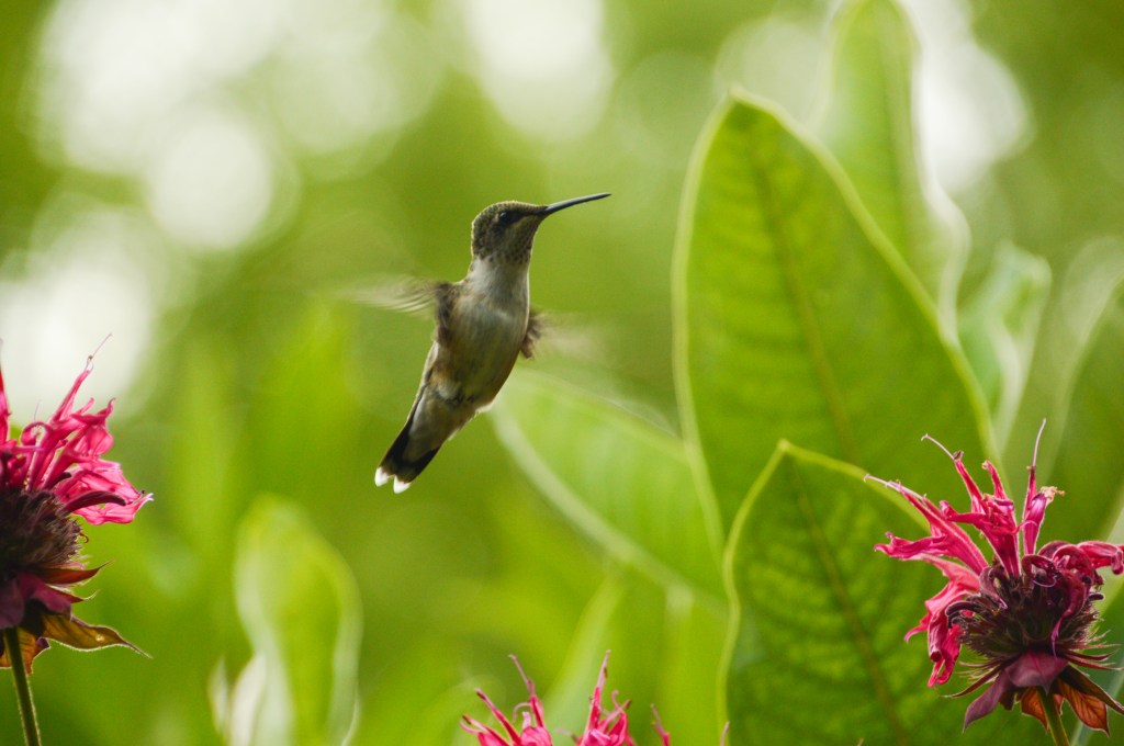 Ruby-throated hummingbird readily befriending the backyard bee balm.