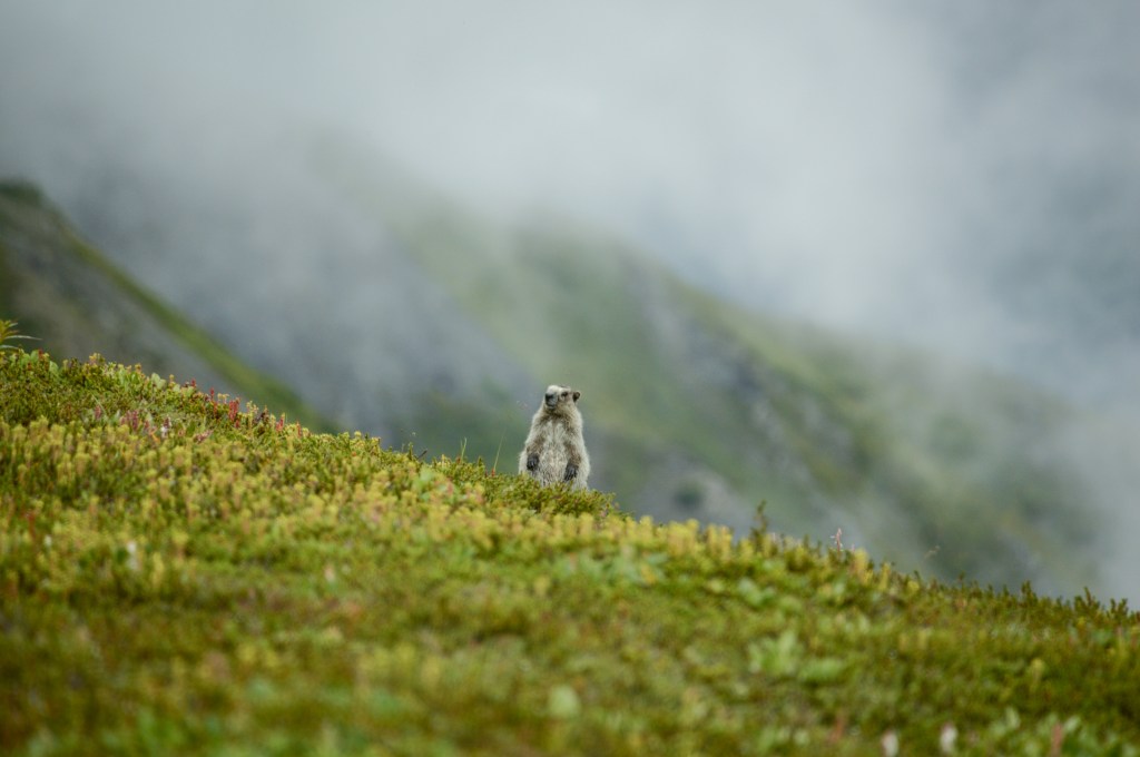 A curious marmot and a foggy summer day in the mountains.